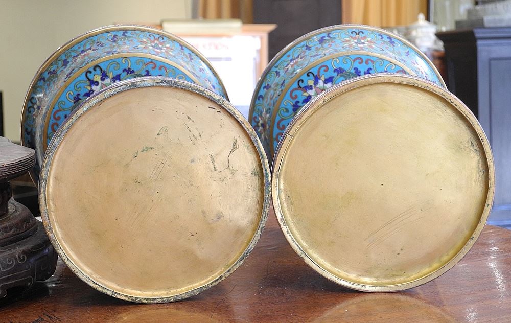 Chinese Cloisonne 3 Pc. Garniture on Stand, Late Qing, 21" high.