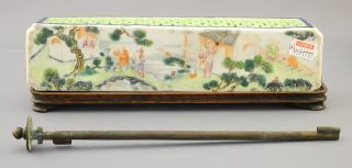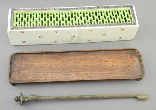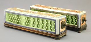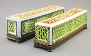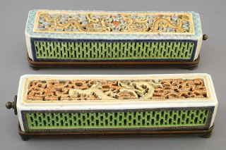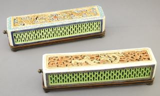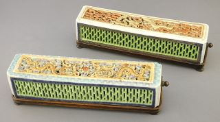 Two Qing Porcelain Cricket Cages on Stands, 1 3/4" x 8 1/2" x 1 3/4".