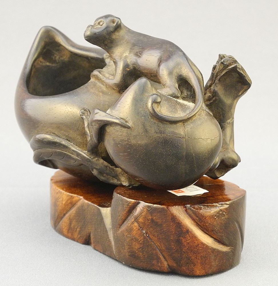 LOT 120 Chinese Hardwood Monkey & Persimmon Brush Washer on Stand, 4 3/8". Estimate: $200 - $300 Sold For: $220 Auction Date: Tuesday, October 08 2024 at 4:00 PM