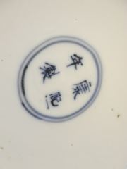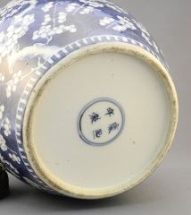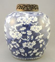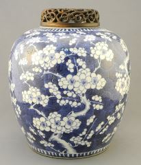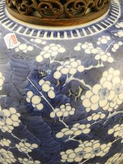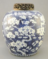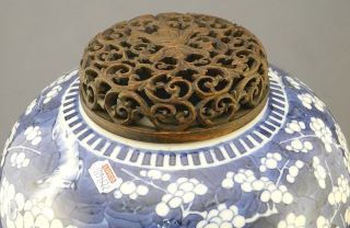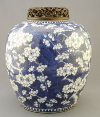 19th Century Blue & White Porcelain Prunus Jar with Wood Cover, 10" h., Resto. Noted.