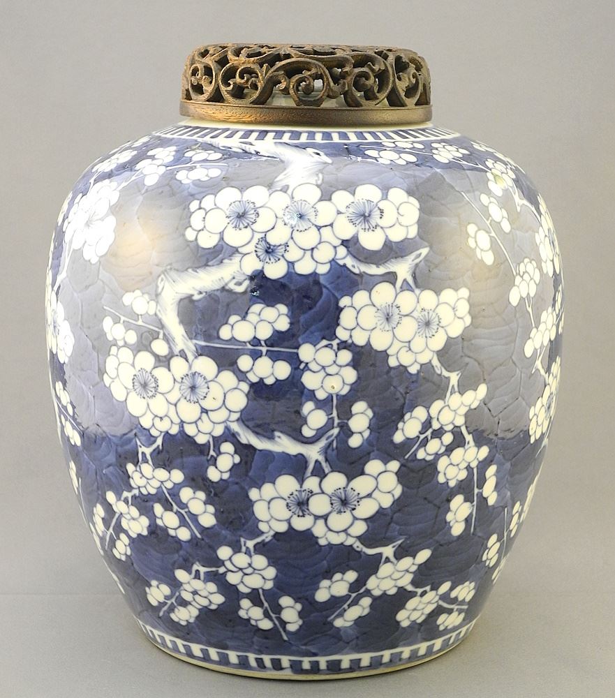 LOT 116 19th Century Blue & White Porcelain Prunus Jar with Wood Cover, 10" h., Resto. Noted. Estimate: $200 - $400 Sold For: $375 Auction Date: Tuesday, October 08 2024 at 4:00 PM