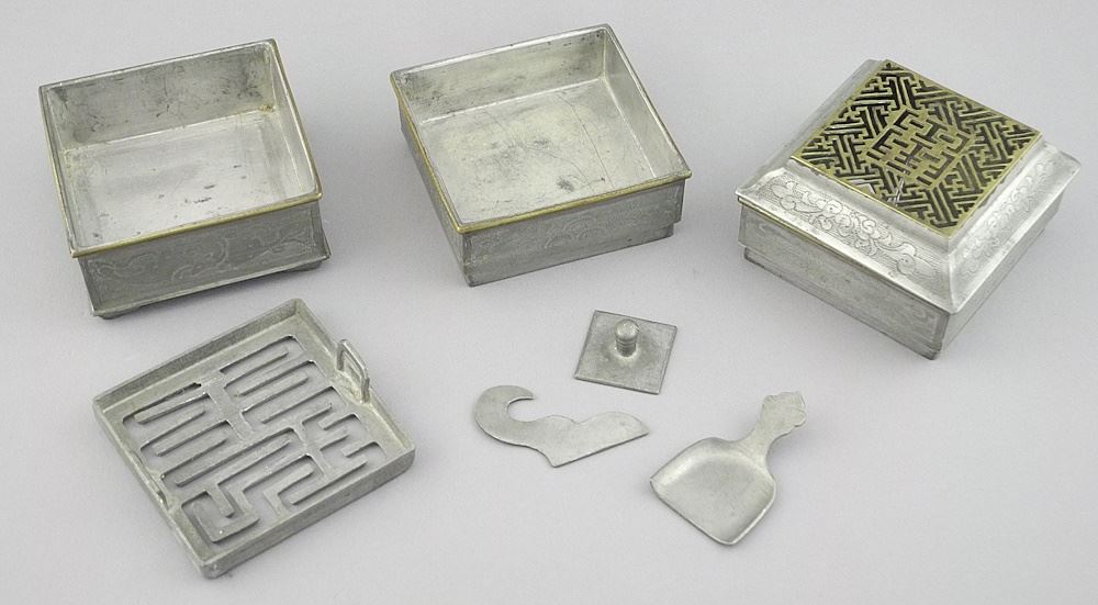 Qing Pewter Incense Clock with Grill/ Tamper/ Scoop/ Detailer, 4 1/8 x 3 1/4 x 3 1/4"
