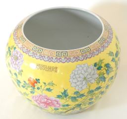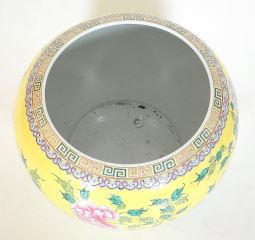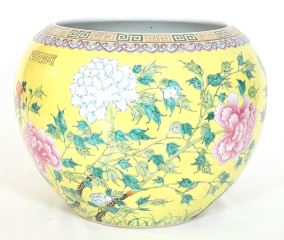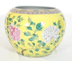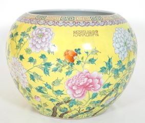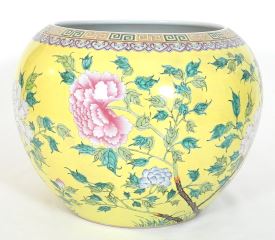 Chinese Famille Rose Porcelain Yellow Ground Jardiniere, Da Ya Zhai Mark, 12 1/4"h.