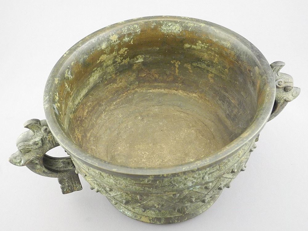 Chinese Archaistic Bronze Gui Censer , Qing Dynasty, 6" x 13 1/2" x 9 1/2" (one handle repaire