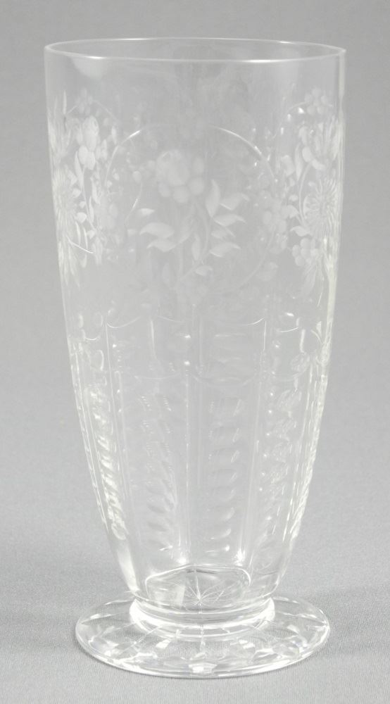 Set of 12 Footed Glass Tumblers Engraved with Rose on Leaf Garlands, 6".
