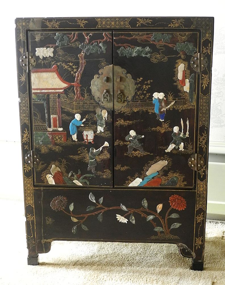 LOT 229 Pair of Chinese Hardstone Decorated Cabinets, 23 1/2" x 10 1/2" x 32"h. Estimate: $400 - $600 Sold For: $475 Auction Date: Tuesday, October 08 2024 at 4:00 PM