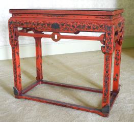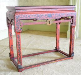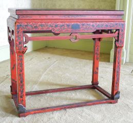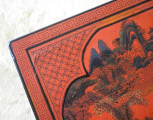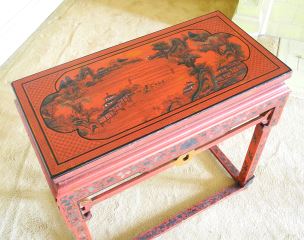 LOT 78 Chinese Red Lacquered Stretcher Table With Landscape Top, 33" x 17" x 30 1/4"h. Estimate: $200 - $400 Auction Date: Tuesday, October 08 2024 at 4:00 PM