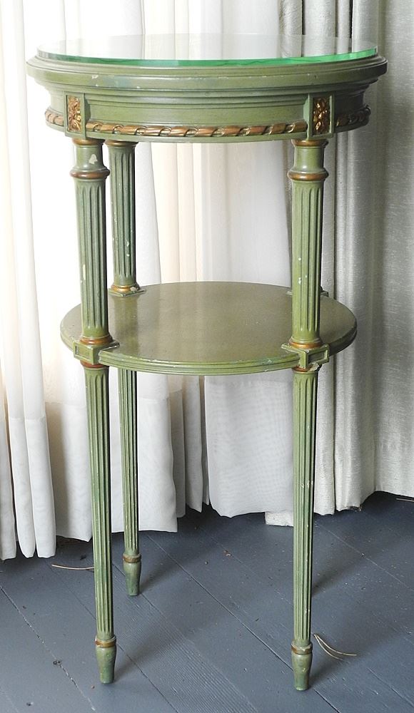LOT 204 Green and Gold Painted Glass Top Circular Occasional table, 16" d x 29 1/2" h. Estimate: $60 - $90 Sold For: $225 Auction Date: Tuesday, October 08 2024 at 4:00 PM