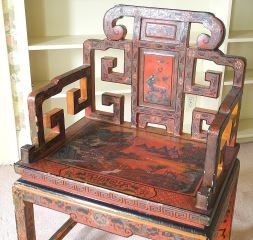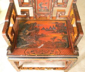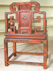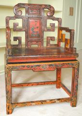 LOT 33 Chinese Antique Red Lacquered Scholar's Armchair, 25" x 19" x 37"h. Estimate: $200 - $400 Sold For: $250 Auction Date: Tuesday, October 08 2024 at 4:00 PM