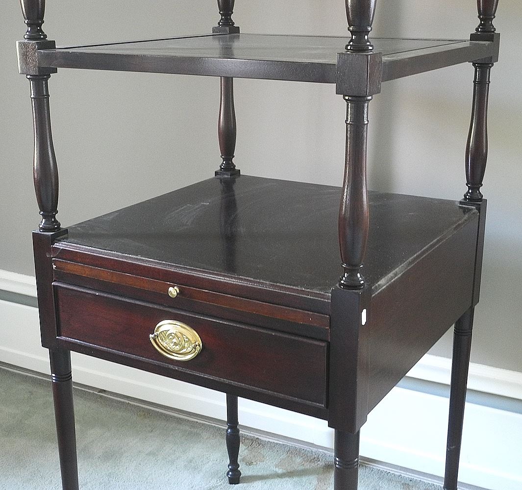 LOT 131 Reproduction Five Tier Display Table, 23 1/2" x 23 1/2" x 74 1/2"h. Estimate: $120 - $160 Sold For: $100 Auction Date: Tuesday, October 08 2024 at 4:00 PM