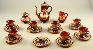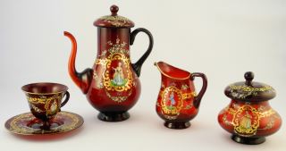 LOT 49 Set of 7 Red Bohemian Glass Cups & Saucers / Creamer / Sugar & Coffee Pot. Estimate: $250 - $350 Sold For: $375 Auction Date: Tuesday, October 08 2024 at 4:00 PM