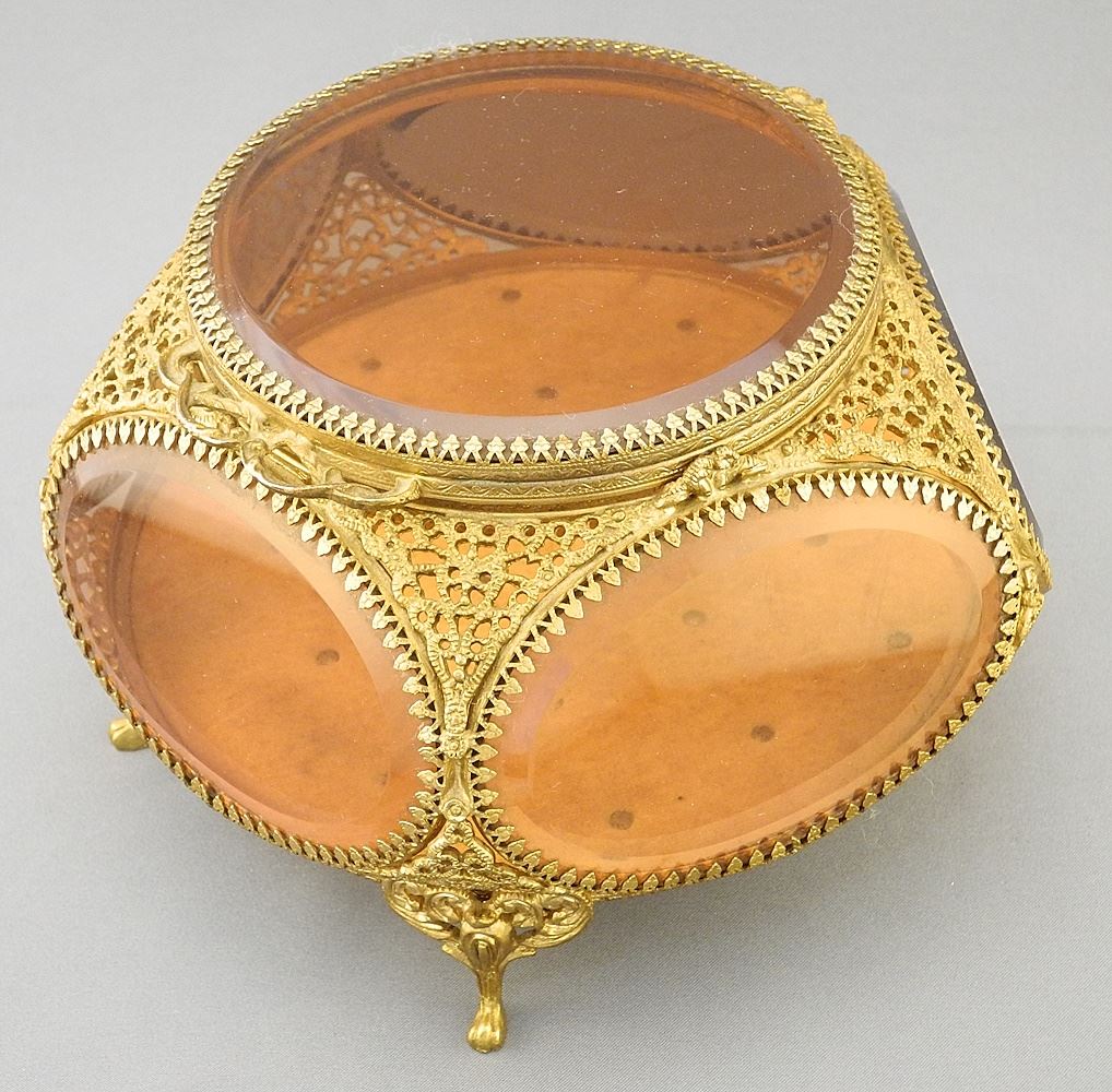 LOT 51 Pentagonal Rose Glass and Gilt Metal Dresser Casket, 4 1/2" x 6 7/8" Diameter. Estimate: $150 - $300 Sold For: $425 Auction Date: Tuesday, October 08 2024 at 4:00 PM