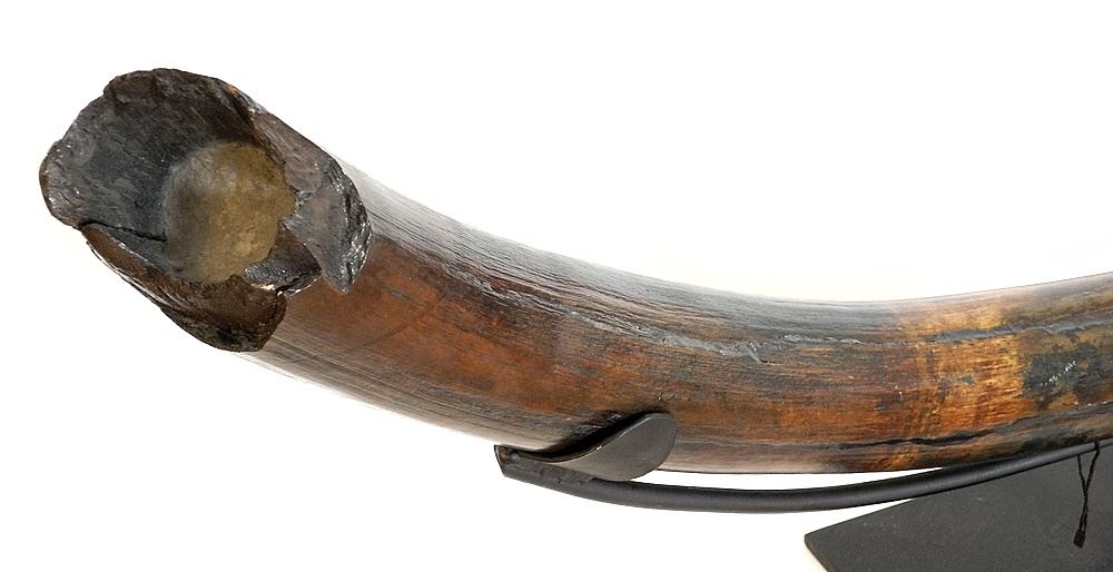 Prehistoric Mammoth Tusk on Stand 46 1/2"L, Some Blue Vivianite Colouration.