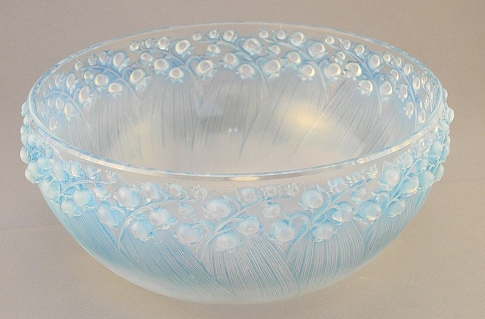 Rene Lalique Glass "Muguet-2" Blue Opalescent Glass Bowl, 4" x 9 1/2" Diameter.