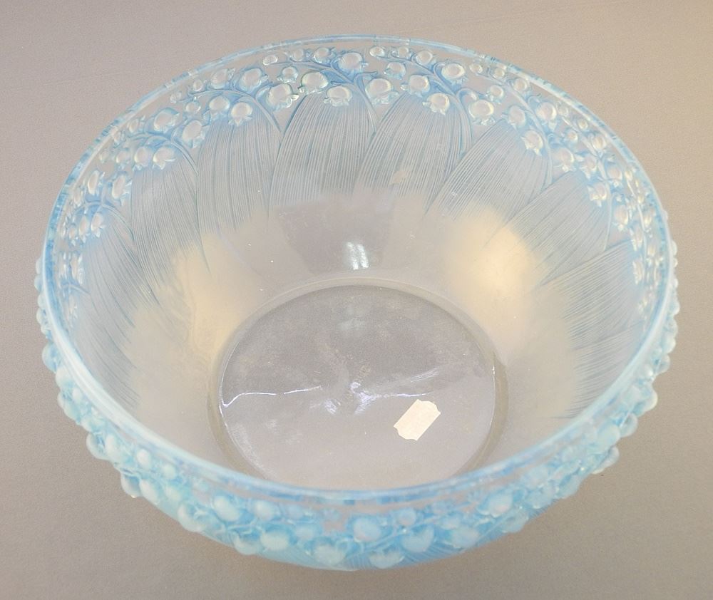 LOT 10 Rene Lalique Glass "Muguet-2" Blue Opalescent Glass Bowl, 4" x 9 1/2" Diameter. Estimate: $600 - $900 Sold For: $850 Auction Date: Tuesday, October 08 2024 at 4:00 PM