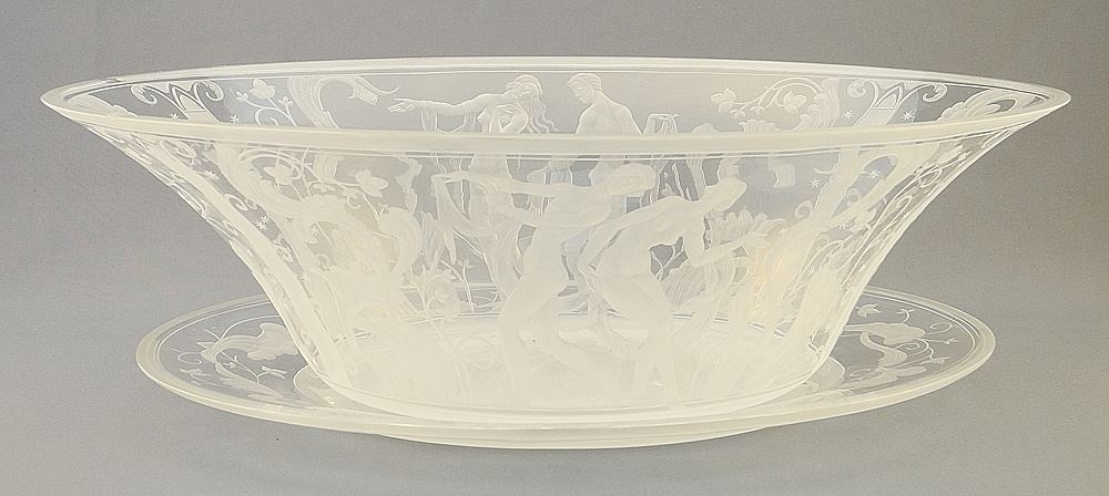Orrefors Oval Bowl & Stand Signed S. Gate 147 E. Weidlich, 4 1/2" x 14 5/8" x 8 7/8", chips.