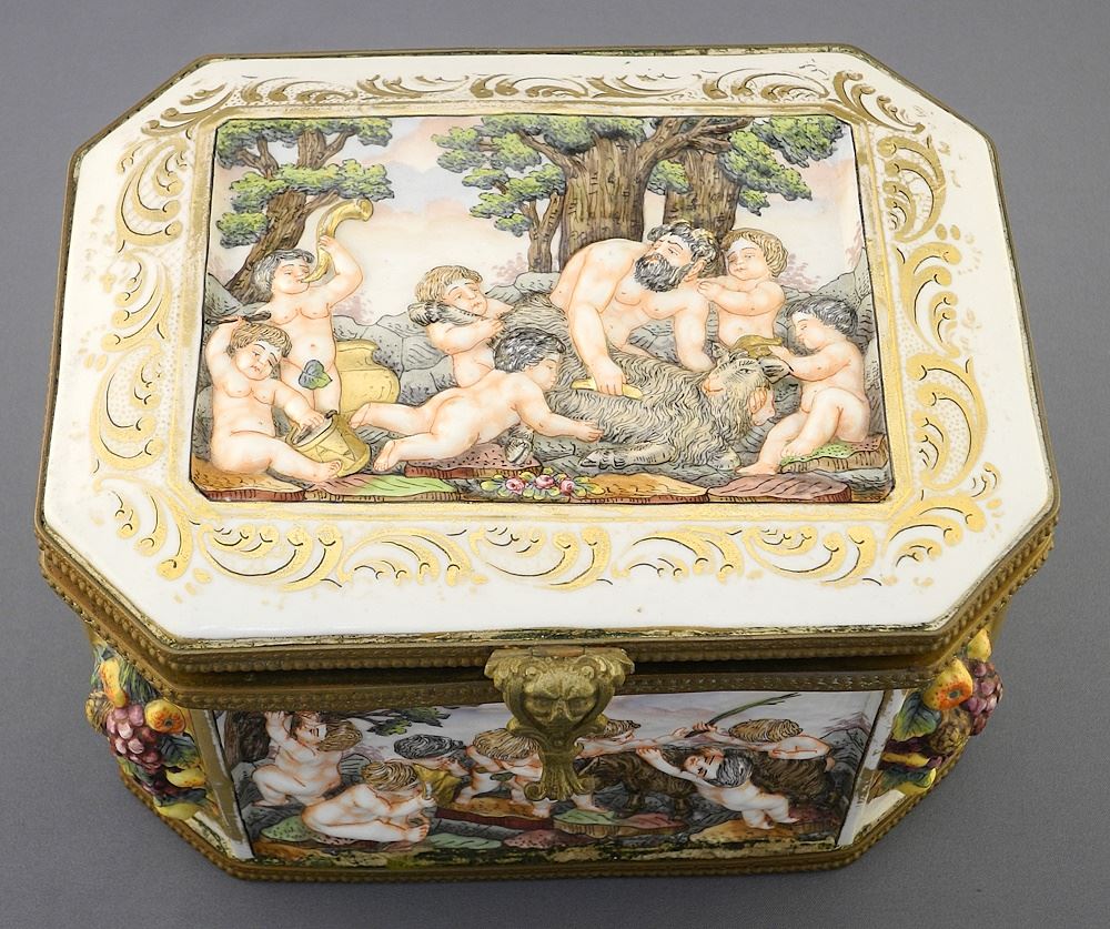 Capo Di Monte Porcelain Casket, 4 1/2" x 8" x 6 1/2" (restored).