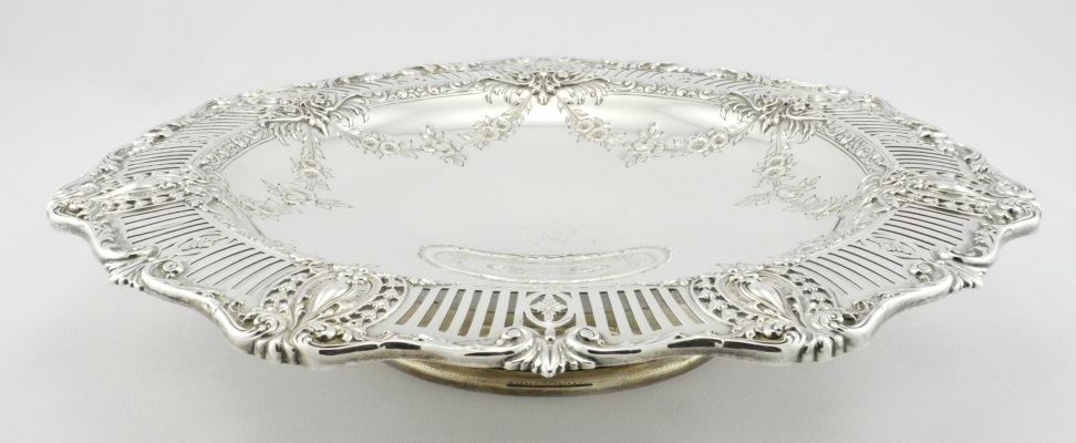 LOT 231 American Silver Circular Cake Dish on Low Foot with Swags of Roses, 12" , 769g. Estimate: $500 - $600 Sold For: $670 Auction Date: Tuesday, October 08 2024 at 4:00 PM