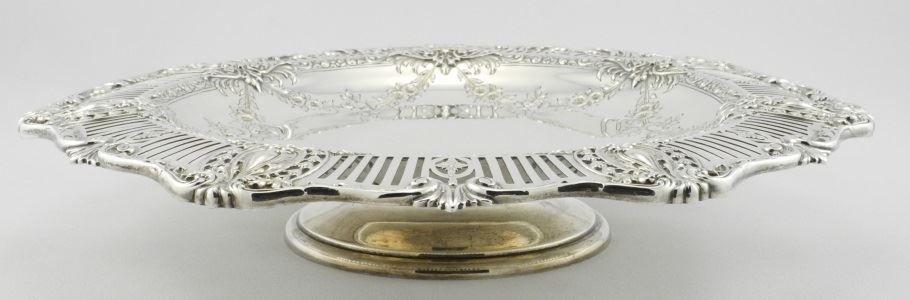 American Silver Circular Cake Dish on Low Foot with Swags of Roses, 12" , 769g.