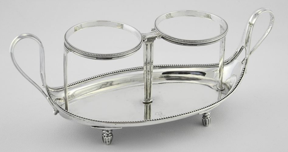 LOT 39 George III 2 Bottle Cruet, London 1785, Maker John Scofield (bottles chipped). Estimate: $300 - $400 Sold For: $450 Auction Date: Tuesday, October 08 2024 at 4:00 PM