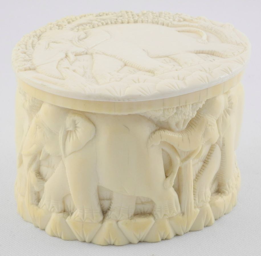 LOT 162 Carved Ivory Covered Box Decorated with Elephants. NO EXPORT. Estimate: $250 - $350 Sold For: $300 Auction Date: Tuesday, October 08 2024 at 4:00 PM