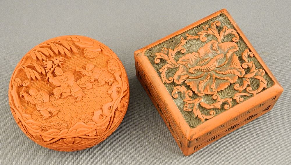 Small Round Carved Cinnabar Lacquer Box and a Small Similar Box (one lid repaired).