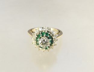 LOT 426 - 14K yellow and white gold ring set with .61 ct round brilliant diamond, 16 diamonds and 10 emeral