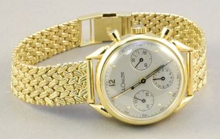 LOT 452 - Le Coultre 14K gold chronograph with 14K strap, just serviced by Jaeger Le Coultre.