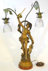 LOT 748 - Spelter figured double table lamp signed Aug. Moreau, 33 1/2".