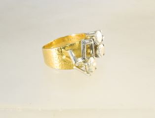 LOT 26 - 18K Gold and Platinum Claw Set Ring with 3 large & 16 baguette diamonds signed Cavelti.