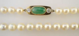 LOT 14 - Strand of Uniform Cultured Pearls (9-9.5mm) with 18K (marked) Jade & Diamond Clasp, 29"L, 99.96