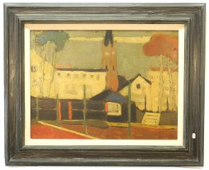 LOT 83 - Oil on Canvas signed Tom (Reimer), 38" x 48", "Modernist Cityscape".