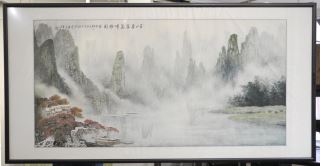 LOT 195 - Chinese Ink & Colour Scroll Painting , Sight 50" x 22 1/2", "Classical Mountain Scape".