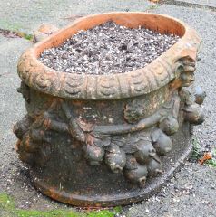 Pair of terracotta urns molded with fruiting swags, 22" wide.