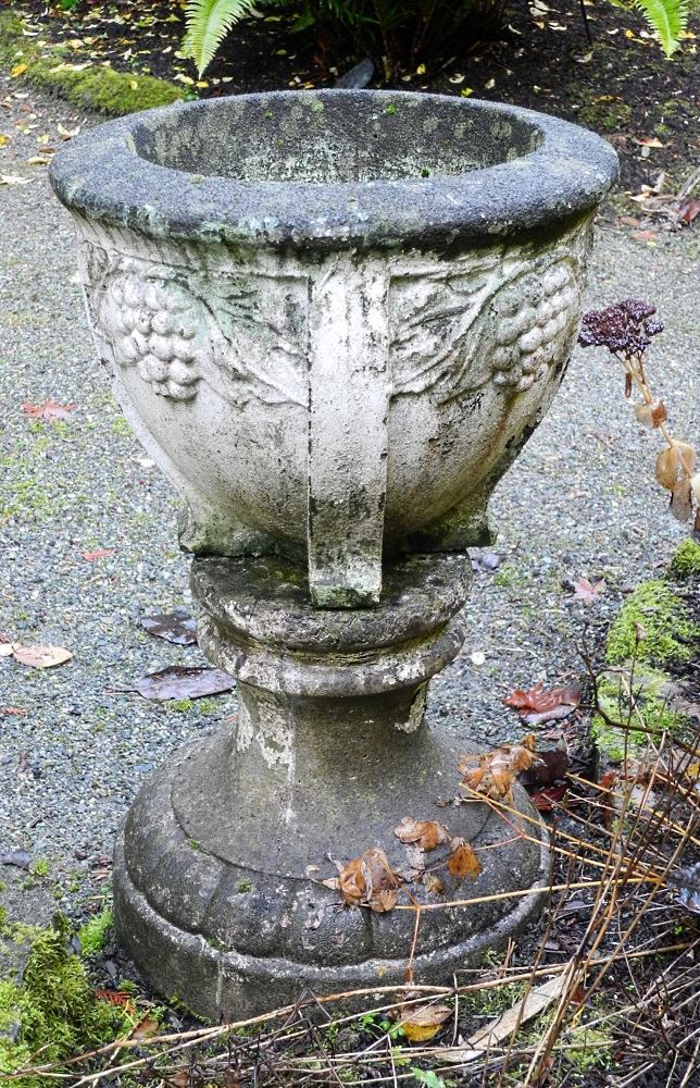 Concrete grape motif urn upon pedestal base, 24" high.