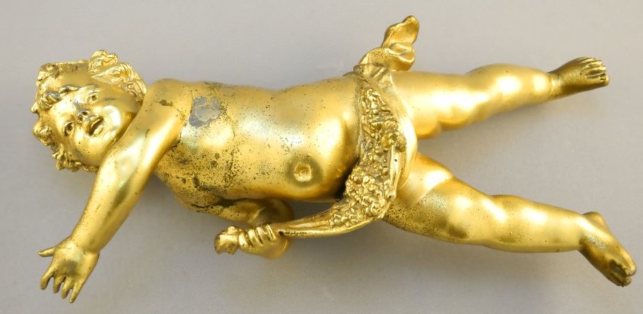 LOT 212 Gilt alloy figure of a frolicking putto, finished rubbed, 10 1/2" high. Estimate: $50 - $100 Sold For: $120 Auction Date: Tuesday, January 19 2021 at 6:00 PM