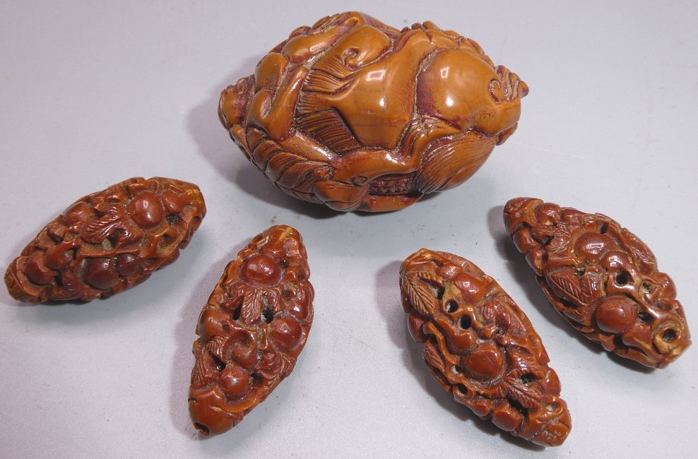 Group of microcarving seed beads of "Guardian Beats" & "Eternal Peach", 20th Century style.