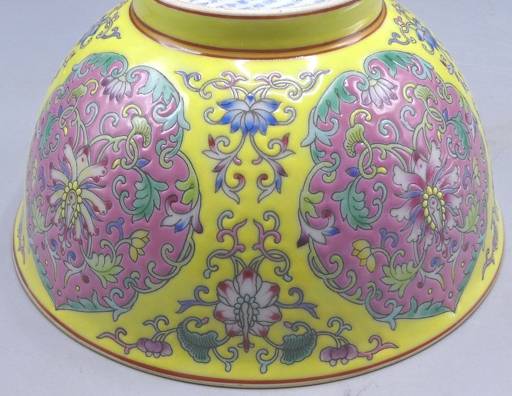 Yellow Ground Famille Rose "Flower Medallion" Bowl, Ch'ieng-lung Mark, 6 1/2" diameter.