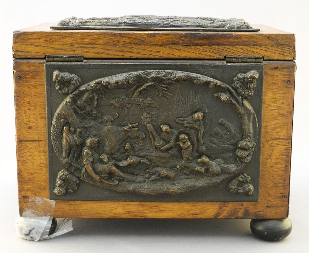 LOT 132 Copper Alloy Plaque Inset Oak Tea Caddy, 8" wide, damaged. Estimate: $50 - $60 Sold For: $80 Auction Date: Tuesday, June 08 2021 at 6:00 PM