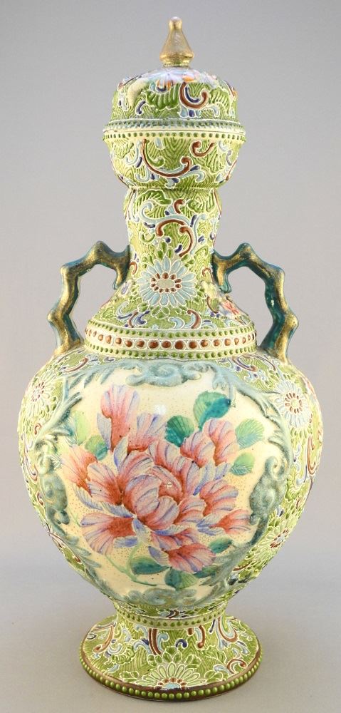 Japanese Yellow Earthware & Moriage Covered Vase, 15 1/4" high, finial restored.