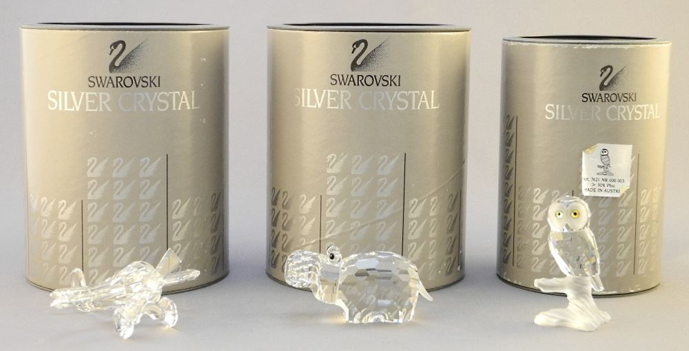 Collection of 3 Swarovski Crystals: Plan, Hippopotamus & Owl.