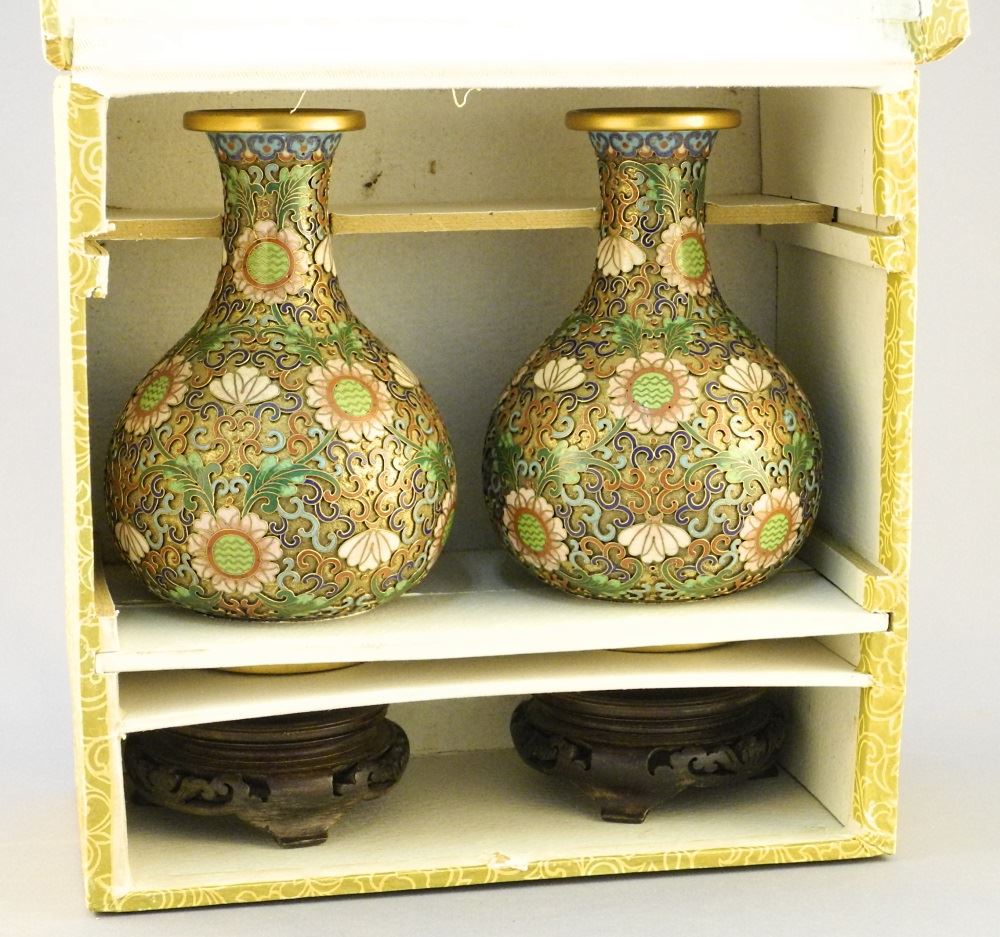 Pair of Cloisonne Vases with Stands & Box, 5 1/4" wide.
