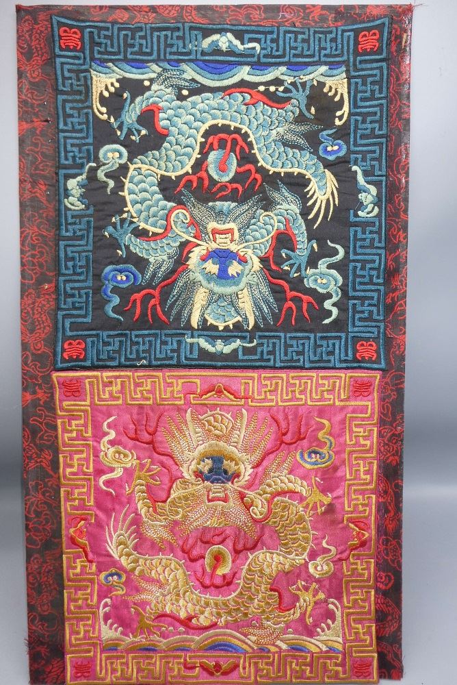 LOT 112 Collection of 2 Dragon Embroideries, 10 1/4" x 10 1/4" each. Estimate: $125 - $150 Sold For: $60 Auction Date: Tuesday, June 08 2021 at 6:00 PM