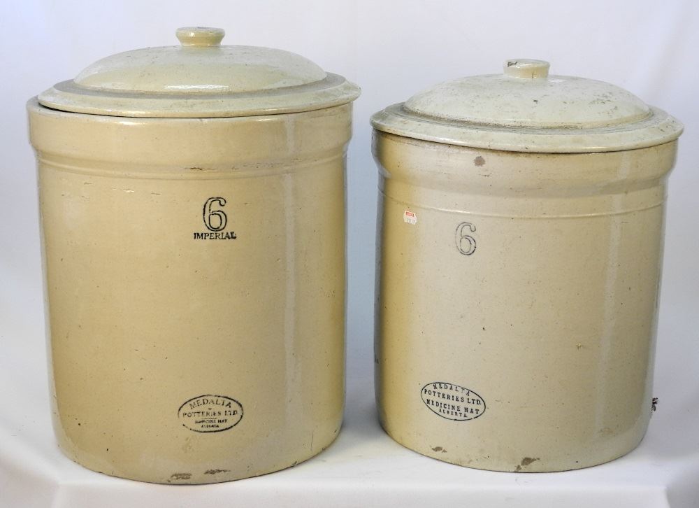 2 Medalta 6 Gallon Crocks with 1 Lid, 1 cracked.