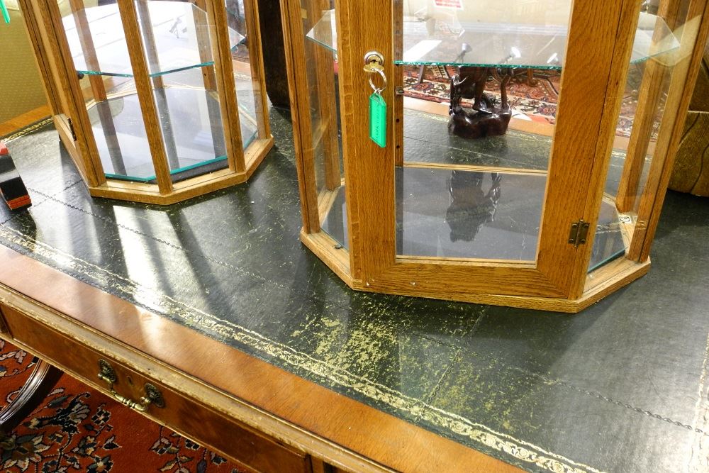 LOT 144 Leather Inset Mahogany Partners Desk, 61" wide. Estimate: $100 - $200 Sold For: $100 Auction Date: Tuesday, June 08 2021 at 6:00 PM
