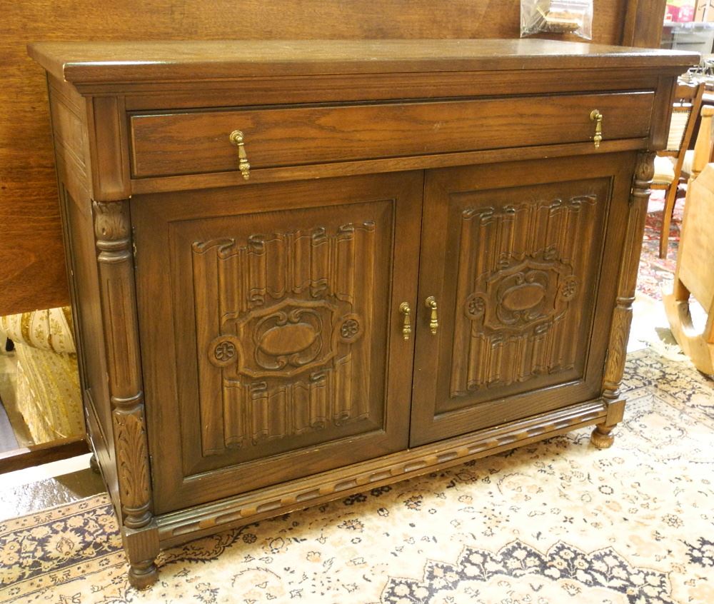 LOT 205 Oak Linen Fold Sideboard, 45 1/4" wide. Estimate: $80 - $100 Sold For: $100 Auction Date: Tuesday, January 18 2022 at 6:00 PM