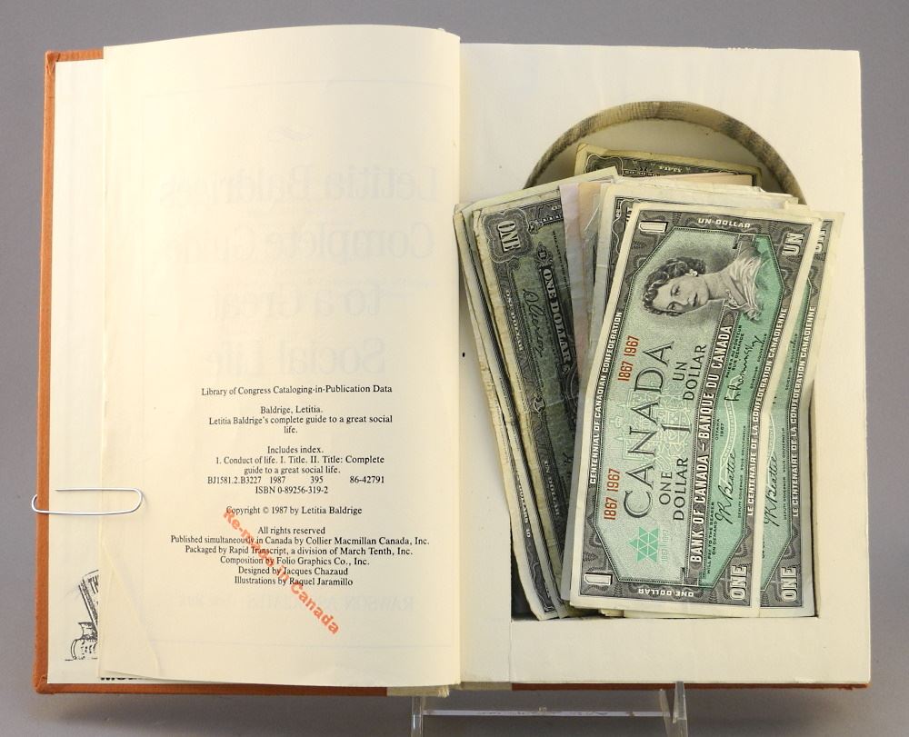 Collection of Canadian & American Bank Notes in Hollow Book Box, 9 1/2" high.