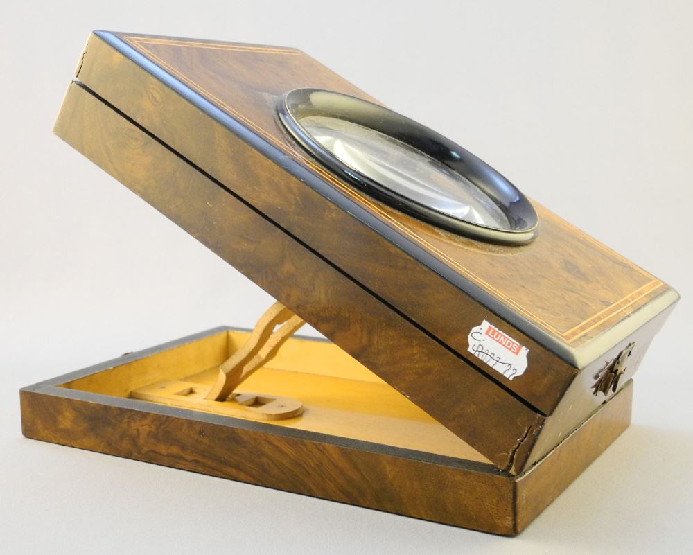 LOT 176 Optical Viewer, Ebonized & Banded Walnut (2 3/4" x 5 3/4" x 9"), Includes Photos, as found. Estimate: $60 - $100 Sold For: $140 Auction Date: Tuesday, January 18 2022 at 6:00 PM