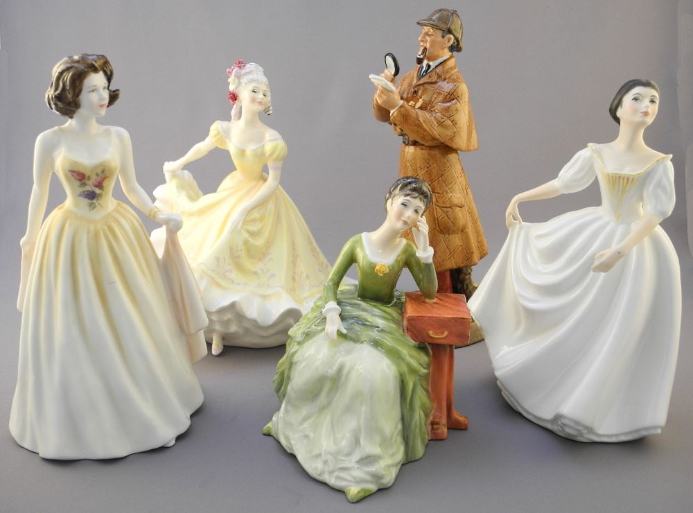 5 Royal Doulton Figurines: Donna/ Jennifer/ Ninette (cracked)/ Carolyn / The Detective, 9 1/2" H.