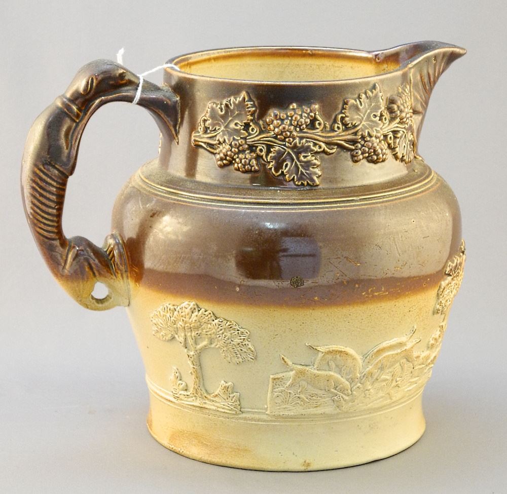 LOT 4 19th Century Staffordshire Hunt Jug, 8" High, Chip/ Foot Rim. Estimate: $50 - $60 Sold For: $60 Auction Date: Tuesday, July 12 2022 at 6:00 PM